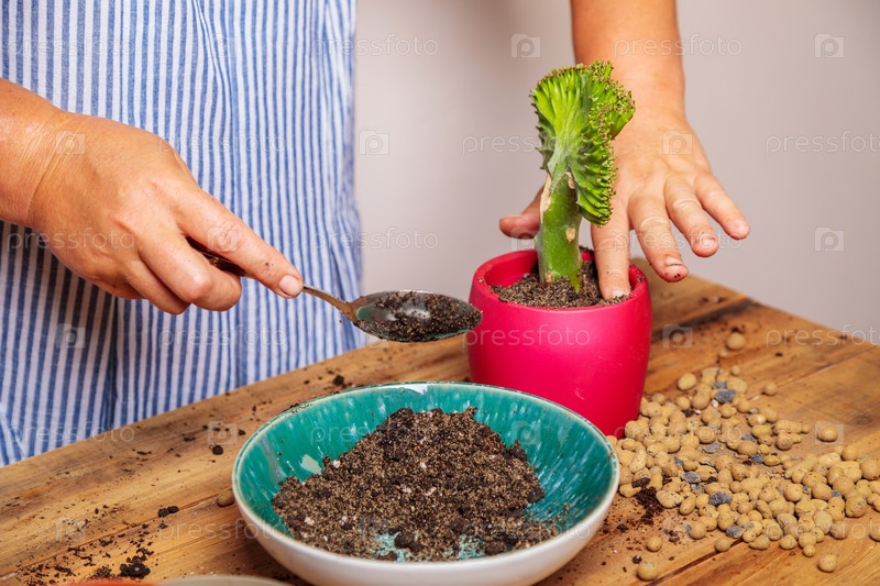Женщина насыпает землю в новый керамический горшок с пересаженным цветком