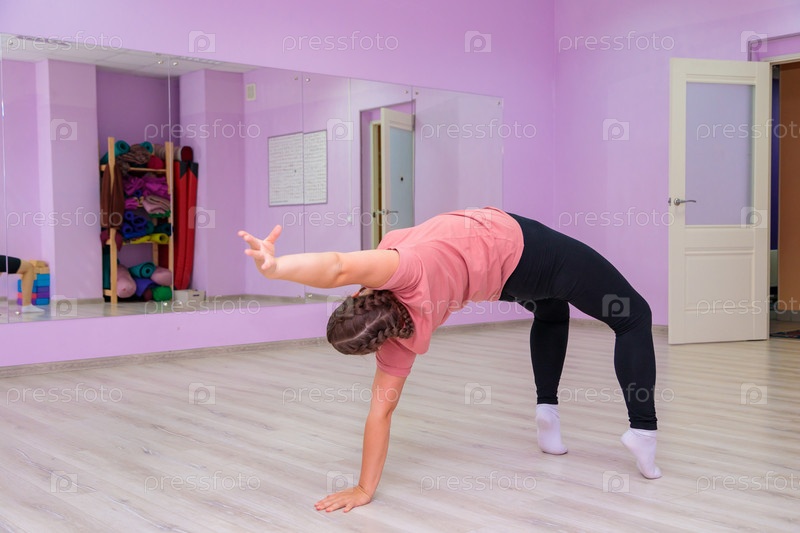 Девушка-инструктор по танцам показывает элементы номера перед зеркалом