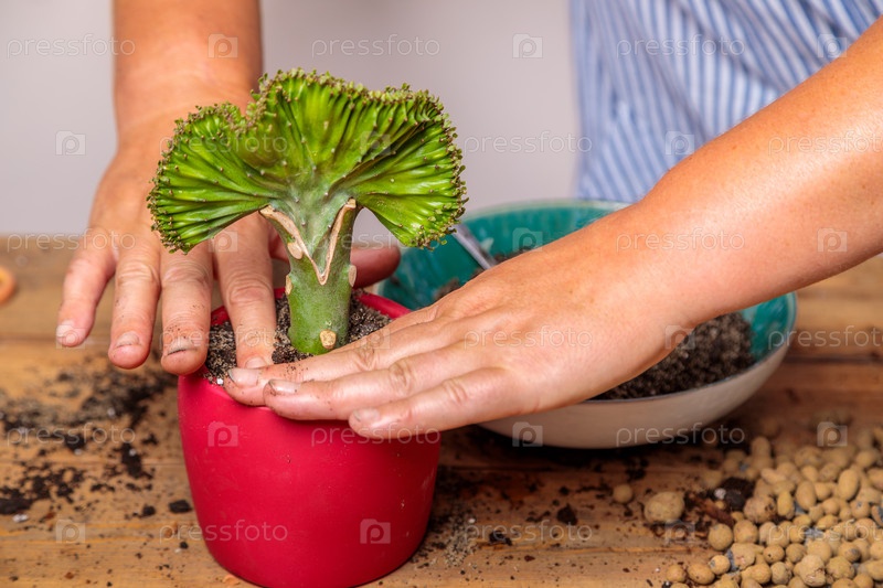 Женщина пересаживает комнатное растение, цветок в керамический горшок. Руки и цветок крупным планом