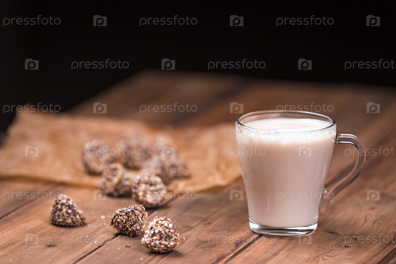 Поток молока льется в стеклянную чашку чая. Чашка на деревянном фоне вокруг конфет