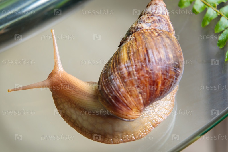 Большая белая улитка ползает по стеклянному столу, шевеля усиками
