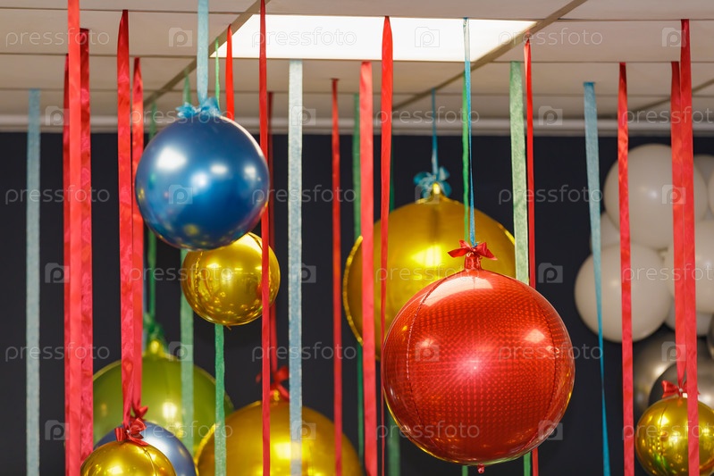 Елочные шары подвешены на ленточках. Празднование нового года, рождества