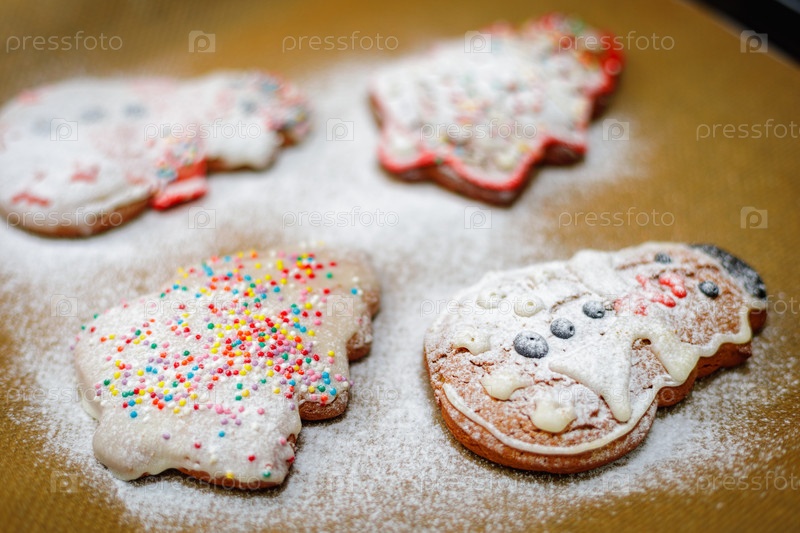 Рождественское печенье, посыпанное сахарной пудрой, на противне. Рождественская елка и снеговик в форме печенья