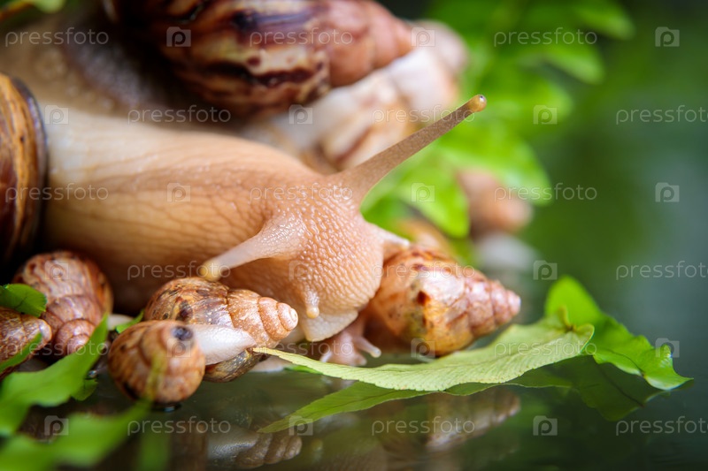 По ветвям растения ползает большая белая улитка с маленькими улитками