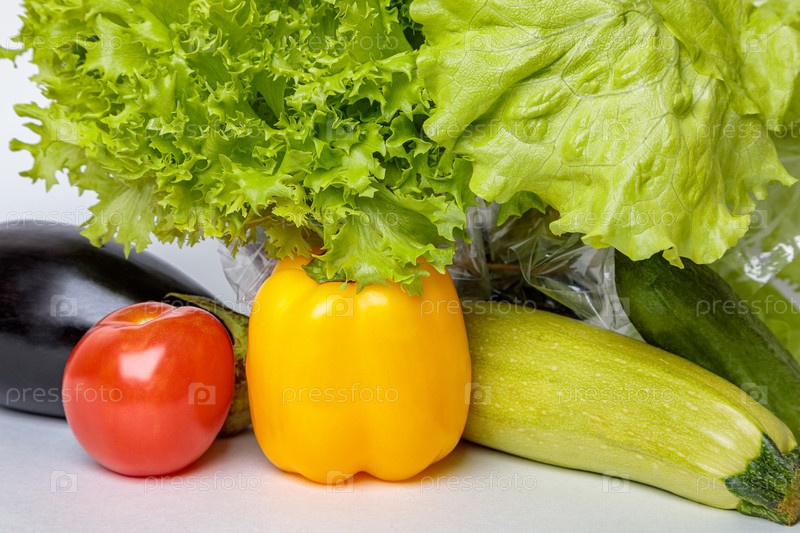 Набор свежих сырых овощей на белом фоне. Салат, помидоры, огурцы, баклажаны, кабачки