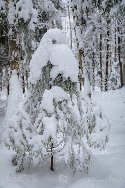 Большие ели в заснеженном лесу. Белый пушистый снег на ветвях деревьев