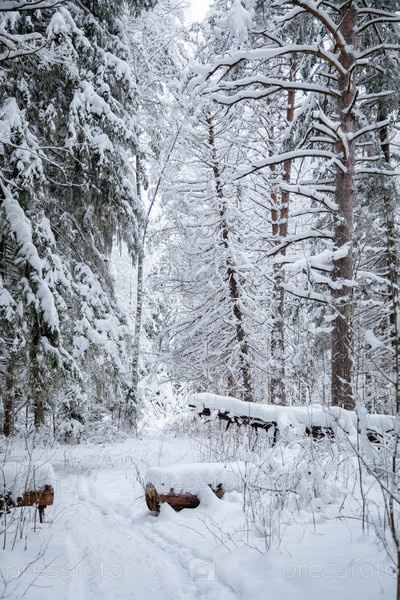 Большие ели в заснеженном лесу. Белый пушистый снег на ветвях деревьев