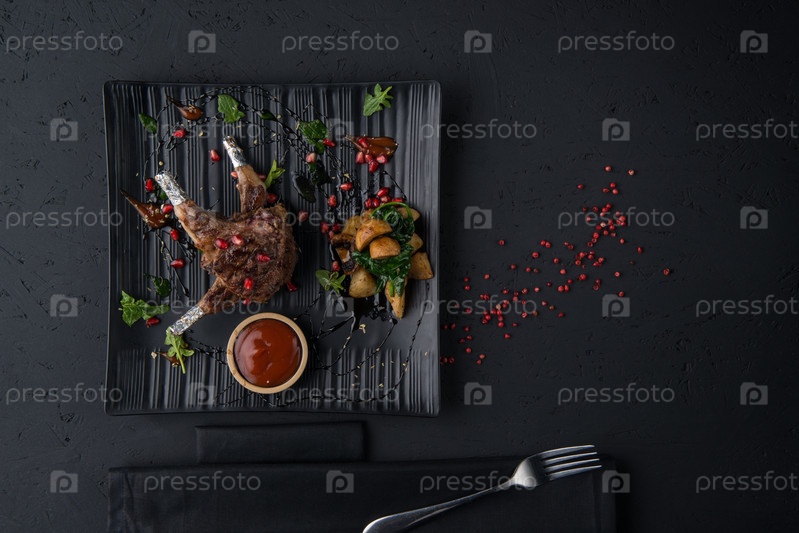 Мясное блюдо на черной поверхности
