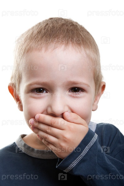 Маленький мальчик закрыл ладонью рот на белом фоне