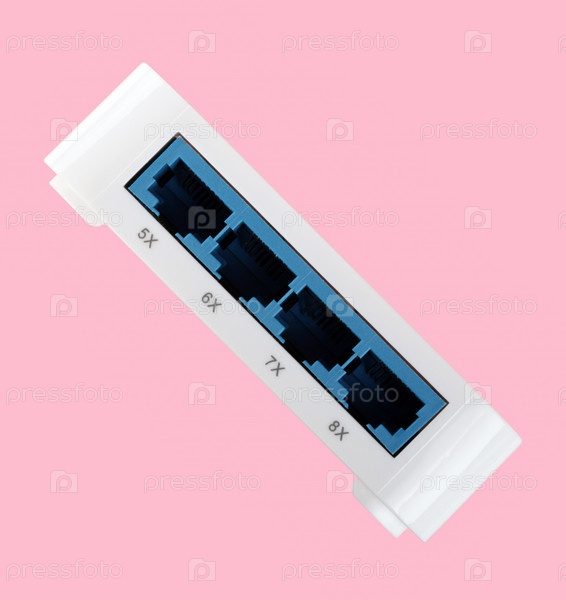 Белый 8-портный пластиковый коммутатор Ethernet изолирован на розовом фоне в сухой день