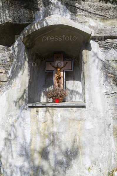 Столб с распятием в нише в скале на горном склоне. Австрийские Альпы, Тироль, окрестности горнолыжного курорта Майрхофен
