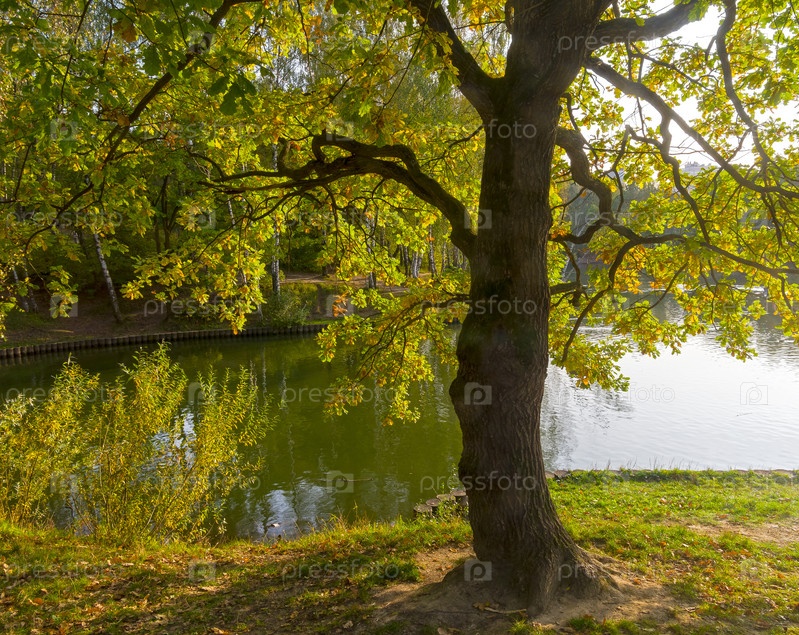 Дуб в контровом свете. Берег пруда в Теплостановском лесопарке. Конец сентября