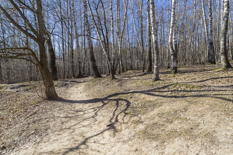 Тень от дерева на склоне оврага. Ландшафтный заказник "Теплый стан", Москва, середина апреля, солнечный день