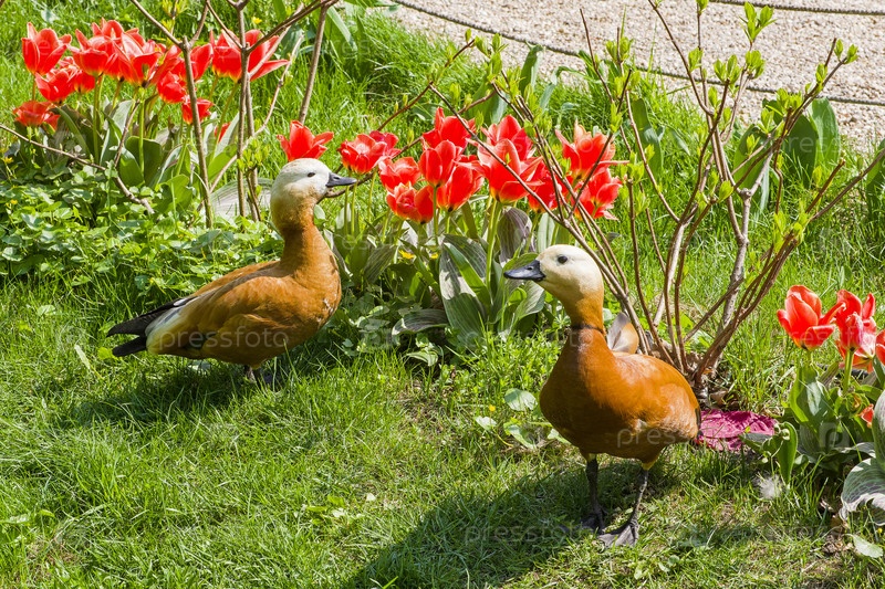 Две утки-огари на газоне рядом с цветущими красными тюльпанами. Солнечный день в мае. Аптекарский Огород (филиал ботанического сада МГУ). Москва