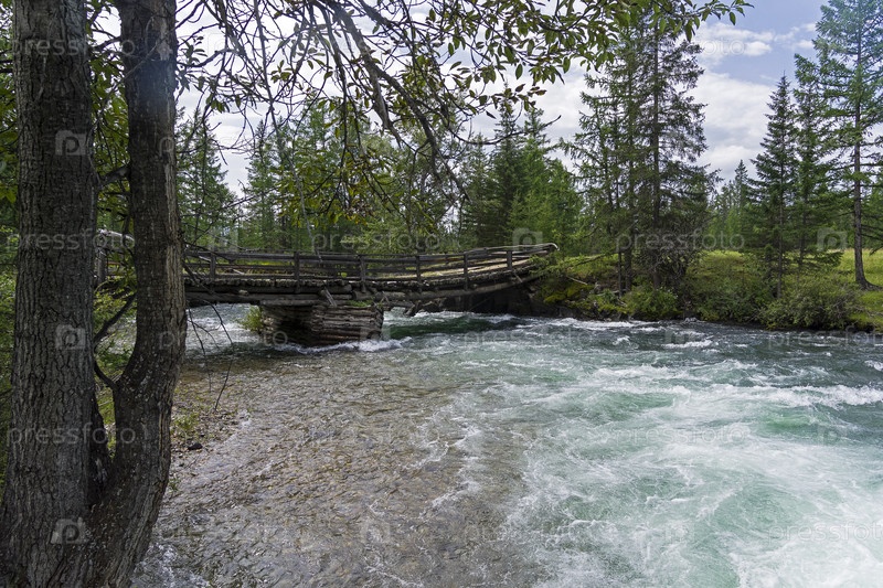 Старый деревянный мост через быструю реку. Река Жомболок, Восточный Саян, Бурятия, Сибирь, Россия