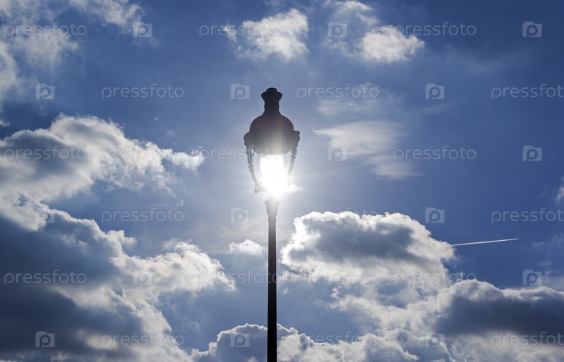 Фонарь на фоне голубого неба. Солнце светит сквозь фонарь