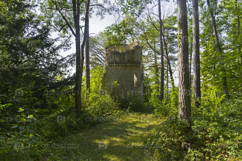 Разрушенная башня в лесу вокруг замка Гранд-Мелло, Франция Солнечный день в августе