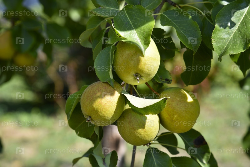 Сочные плоды груши на ветвях осенью в яркий день. Урожай груши в саду