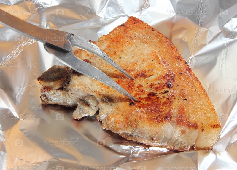 Запеченный кусок свинины на алюминиевой фольге, процесс приготовления мясных блюд в духовке