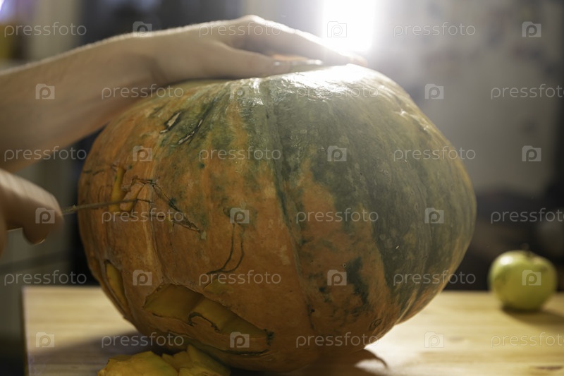 Подготовка к празднику. Процесс вырезания тыквы на Хэллоуин ножом