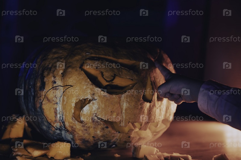 Рука ребенка указывает на вырезанную тыкву Хэллоуина