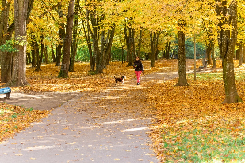 Гродно, Беларусь - 10 октября 2022 г.: Пожилая женщина с собакой на прогулке в осеннем парке