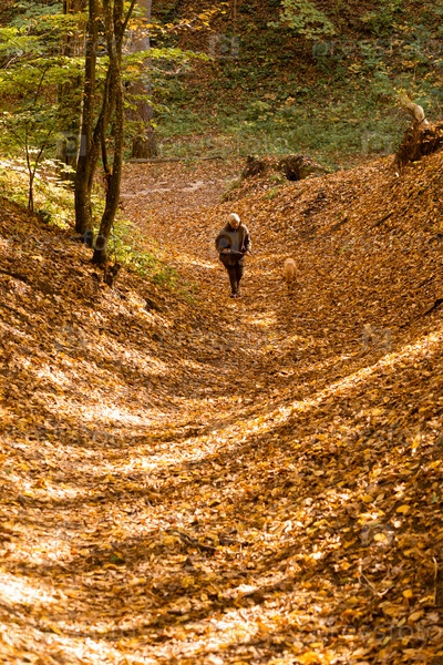 Пожилая женщина с собакой на прогулке