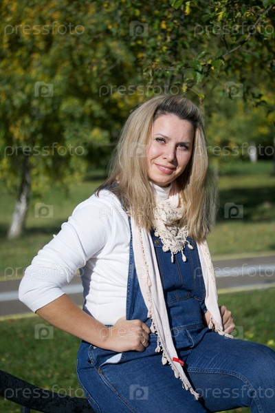 Девушка сидит на скамейке в парке. Одета в осеннюю одежду. Осенний городской парк
