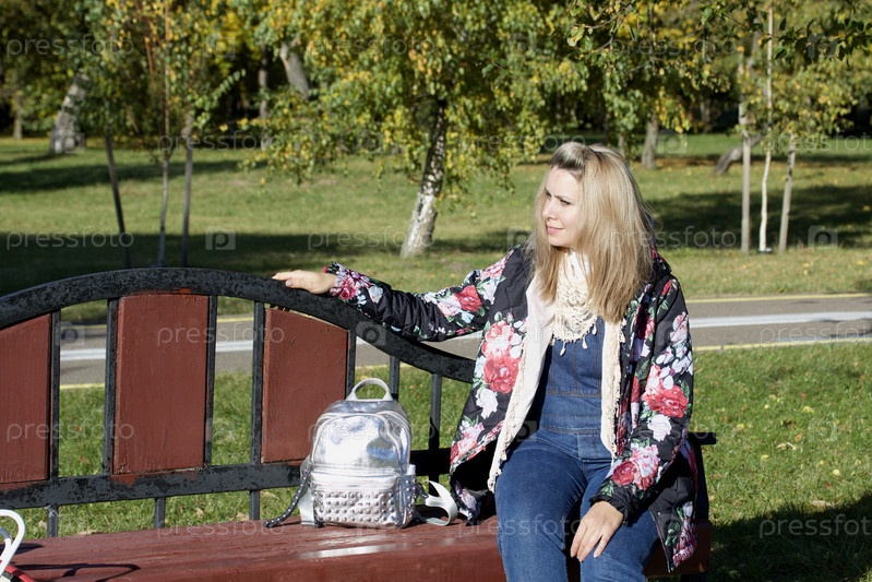 Девушка сидит на скамейке в парке. Одет в осеннюю одежду. Осенний городской парк