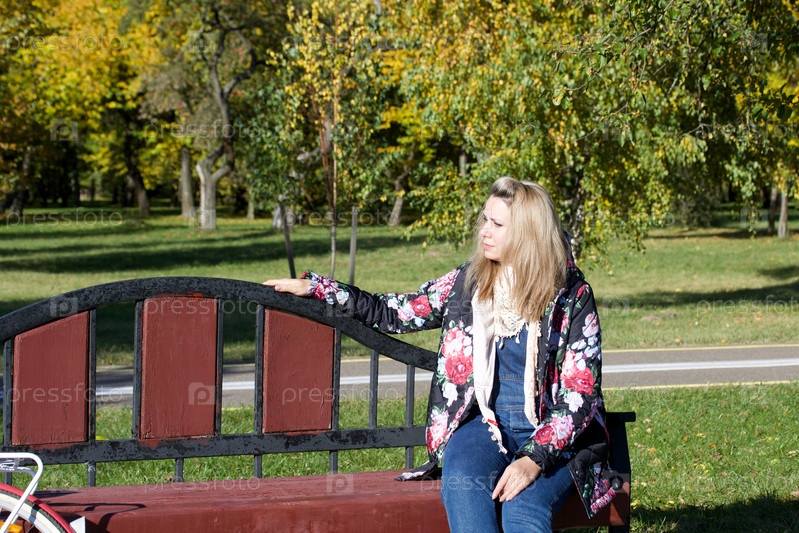 Девушка сидит на скамейке в парке. Одет в осеннюю одежду. Осенний городской парк