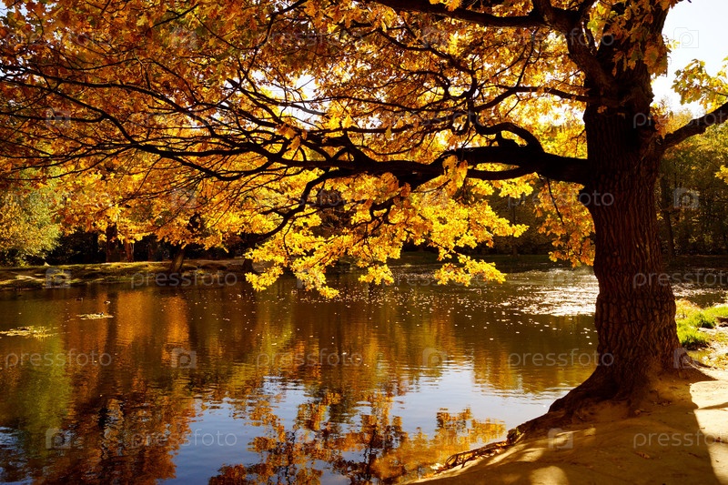 Дуб у озера. Листопад, листья разные по цвету, пейзаж - осенний фон
