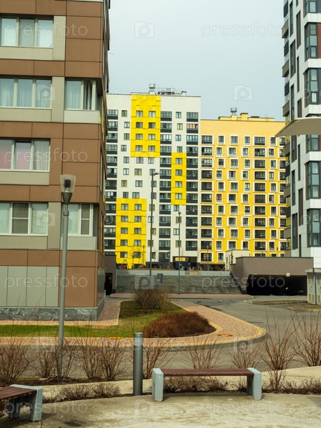 Новый жилой комплекс. Современная архитектура, яркие красочные фасады и удобная инфраструктура. Москва, Россия