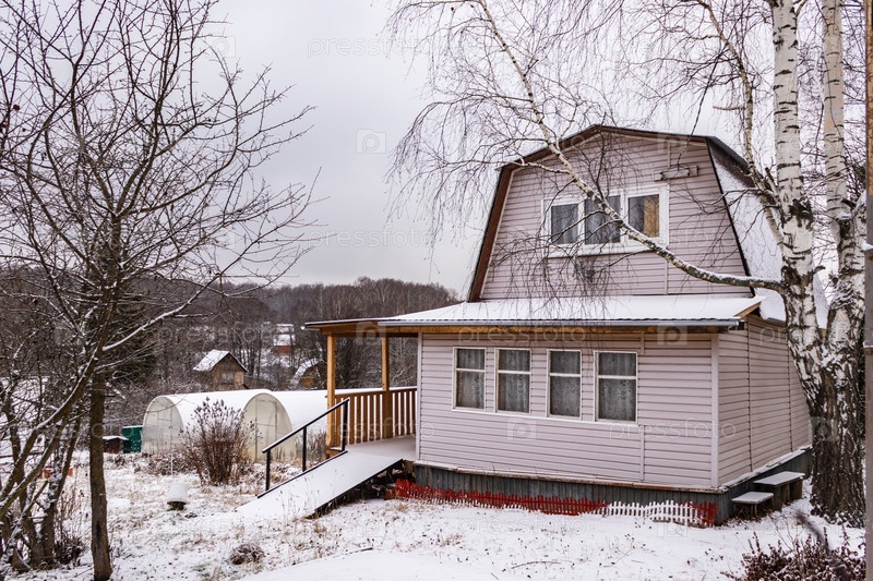Загородный загородный участок с домом и теплицей из поликарбоната. Ранняя зима. Тульская область, Россия