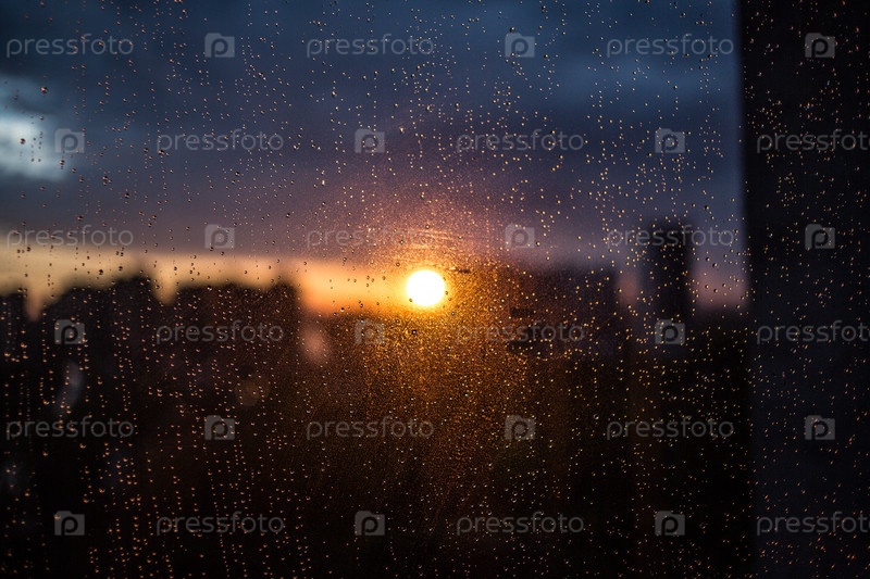 Панорамный вид на новостройки через окно с каплями дождя