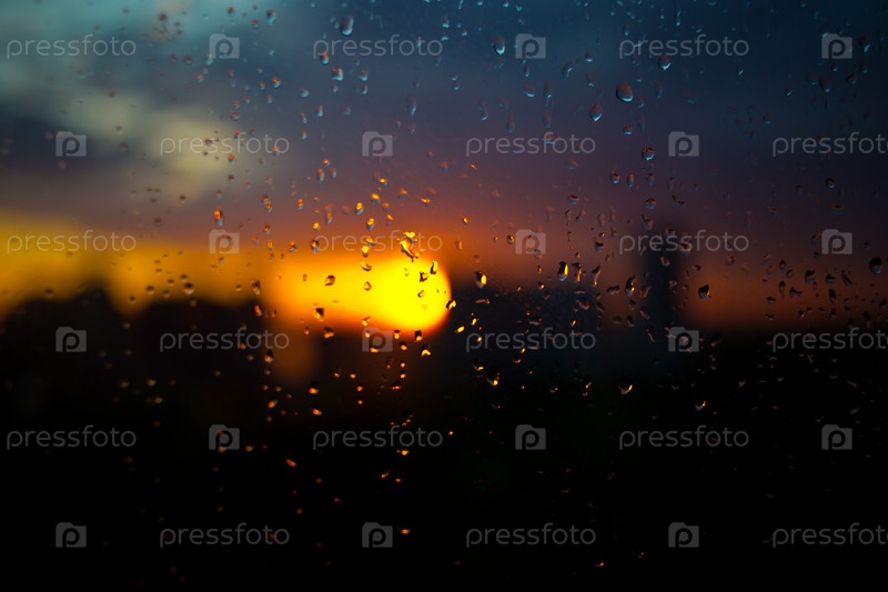 Панорамный вид на новостройки через окно с каплями дождя