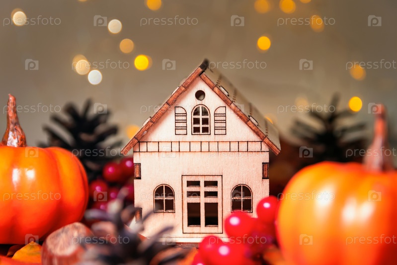 Осенний фон с тыквами, шишками, каштанами, рябиной и боке из деревянного дома