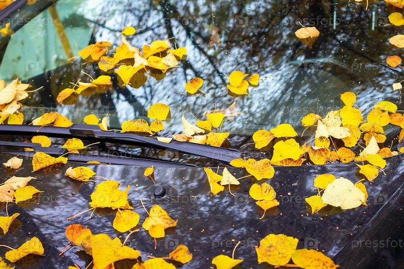 Желтые осенние опавшие листья на капоте и лобовом стекле автомобиля