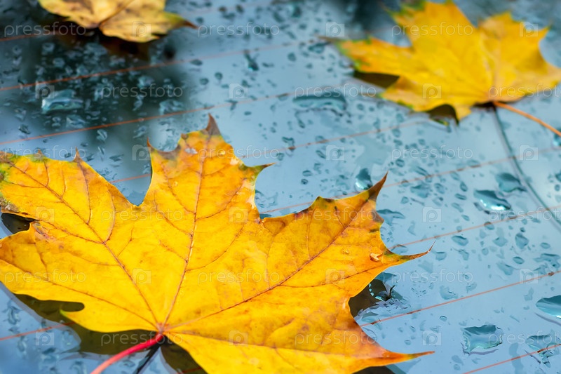 Желтые опавшие осенние листья на мокром окне автомобиля с каплями дождя