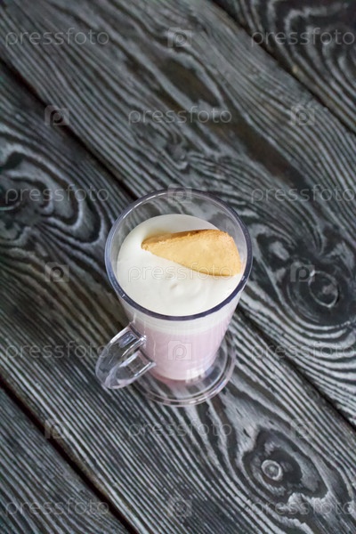 Малиновое суфле в стеклянном бокале. стоит на столе из сосновых досок. Крупный план