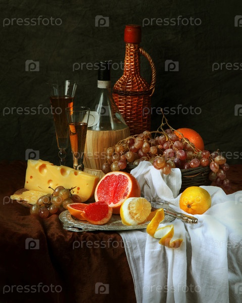 Натюрморт с сельдью, белым вином, лимоном, грейпфрутом, виноградом и сыром