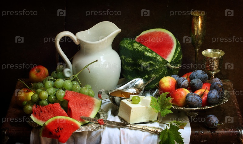 Натюрморт с красным вином и арбузом