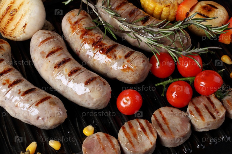 Купаты с овощами на деревянном фоне