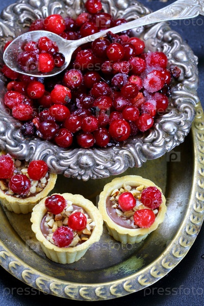 Натюрморт с пирожными с клюквой на синем фоне
