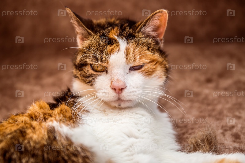 Трехцветная кошечка крупным планом, поврежден глаз