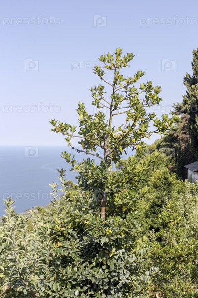Вечнозеленое растение (Ilex aquifolium), растущее на фоне моря в крупном плане