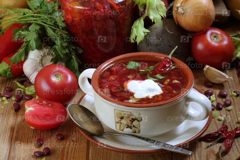 Борщ со сметаной,чесноком и острым перцем на деревянном столе