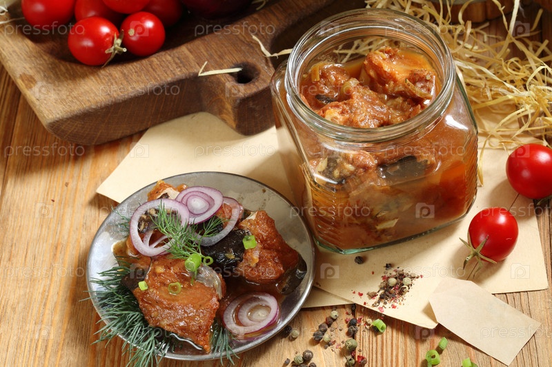 Сом консервированный в томате на деревянном столе в стеклянной банке