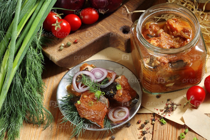 Сом консервированный в томате на деревянном столе в стеклянной банке