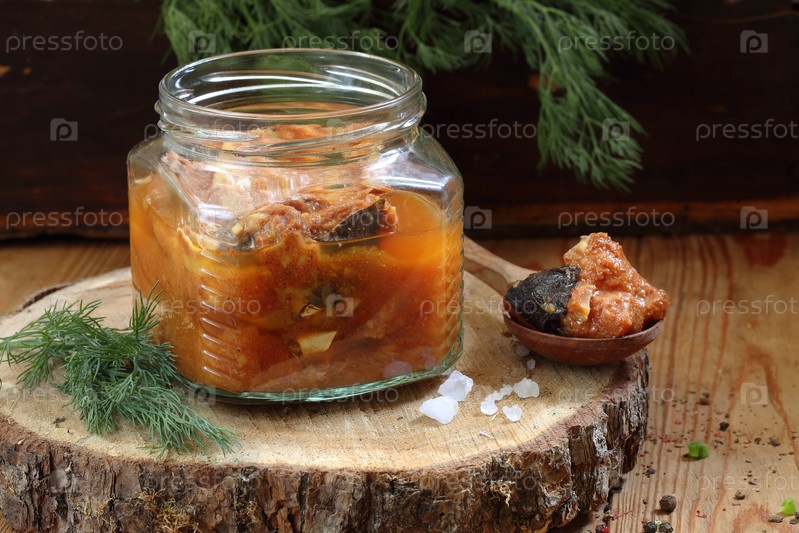 Сом консервированный в томате на деревянном столе в стеклянной банке