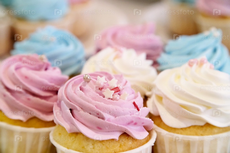 Мини-кексы со взбитыми сливками, украшенные весенней и пасхальной карамельной посыпкой. Дополнительные кексы размыты на заднем плане